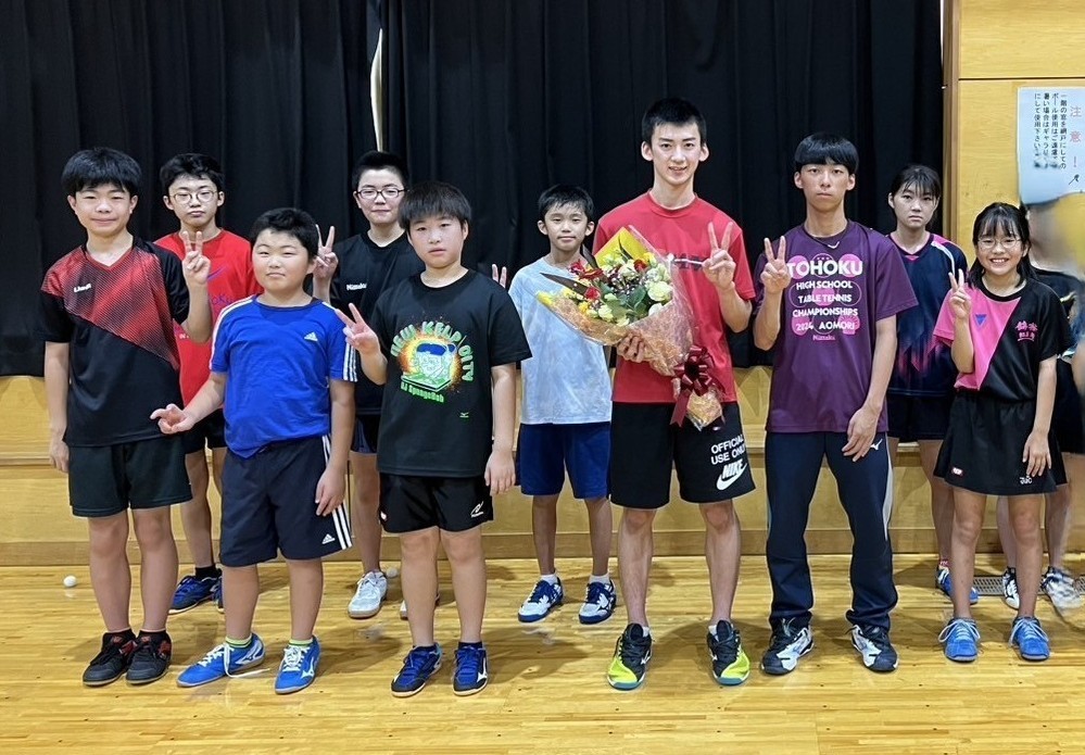 写真は2025年インターハイ卓球男子ダブルス第3位阿部鴻憲選手が鶴岡東高校卒業と大学進学の報告に訪れ、錦桜紅羅舞スポーツ少年団後輩たちを指導してくれました。大学に進み日本一の夢を追い続けます。小学2年から錦桜紅羅舞一筋、そして、鶴岡東高校を経て専修大学へ「二兎を追う者は一兎をも得ず」さらなる活躍を期待します。